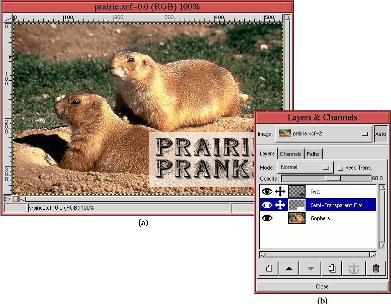 The remaining features of the Layers dialog consist of the Opacity slider, the Keep Trans. toggle button, and, at the bottom of the dialog, a row of function buttons that I call the button bar. These are all discussed in more detail later. However, of these features, the Opacity slider is of immediate interest because it is used in the example shown in Figure 2.3. Figure 2.3(b) shows that the the middle layer strip is highlighted, indicating that this layer, containing the small white rectangle, is active. Careful examination of the Layers dialog shows that the Opacity slider is set to 60.0% for this layer. This means that the layer below can be seen through the white rectangle because the rectangle's layer is only partially opaque. Like for the blending modes, opacity can be independently set for each layer.