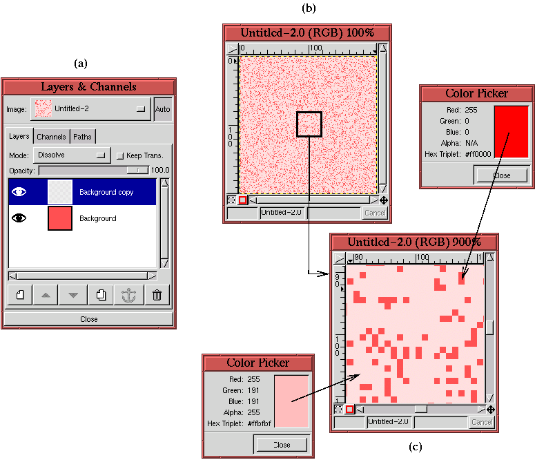 Figure 5.12(b) shows the result of the Dissolve blending mode. Due to the value of the foreground's alpha channel the result is that 75% of the white pixels are 75% opaque and 25% are fully opaque. The details of the effect can be more clearly seen in the small region framed by the black box shown in Figure 5.12(b). This region is zoomed 900% and redisplayed in Figure 5.12(c), which makes the relationship of the red and white pixels more apparent.